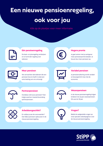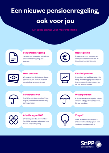 Op deze factsheet vind je de belangrijkste veranderingen in de nieuwe pensioenregeling. Klik op de link hieronder om de pdf te openen. Kopieer de pdf en plaats deze bijvoorbeeld op je intranet of in een nieuwsbrief. Klik op de plaatjes in de pdf om naar onze webpagina met meer informatie te gaan.