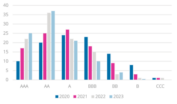 In de grafiek zie je dat sinds 2022 onze beleggingsportefeuille duidelijk is verbeterd. We beleggen bijna niet in bedrijven met een zeer lage ESG-score (CCC). Ook zijn er bijna geen beleggingen in bedrijven met een B-score of lager.