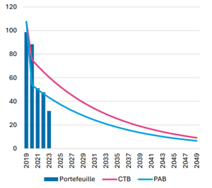 Deze grafiek laat zien dat we ons doel lijken te halen. We liggen onder de curve van de CTB. Ook liggen we voor op het pad van de PAB (Parijs Aligned Benchmark).